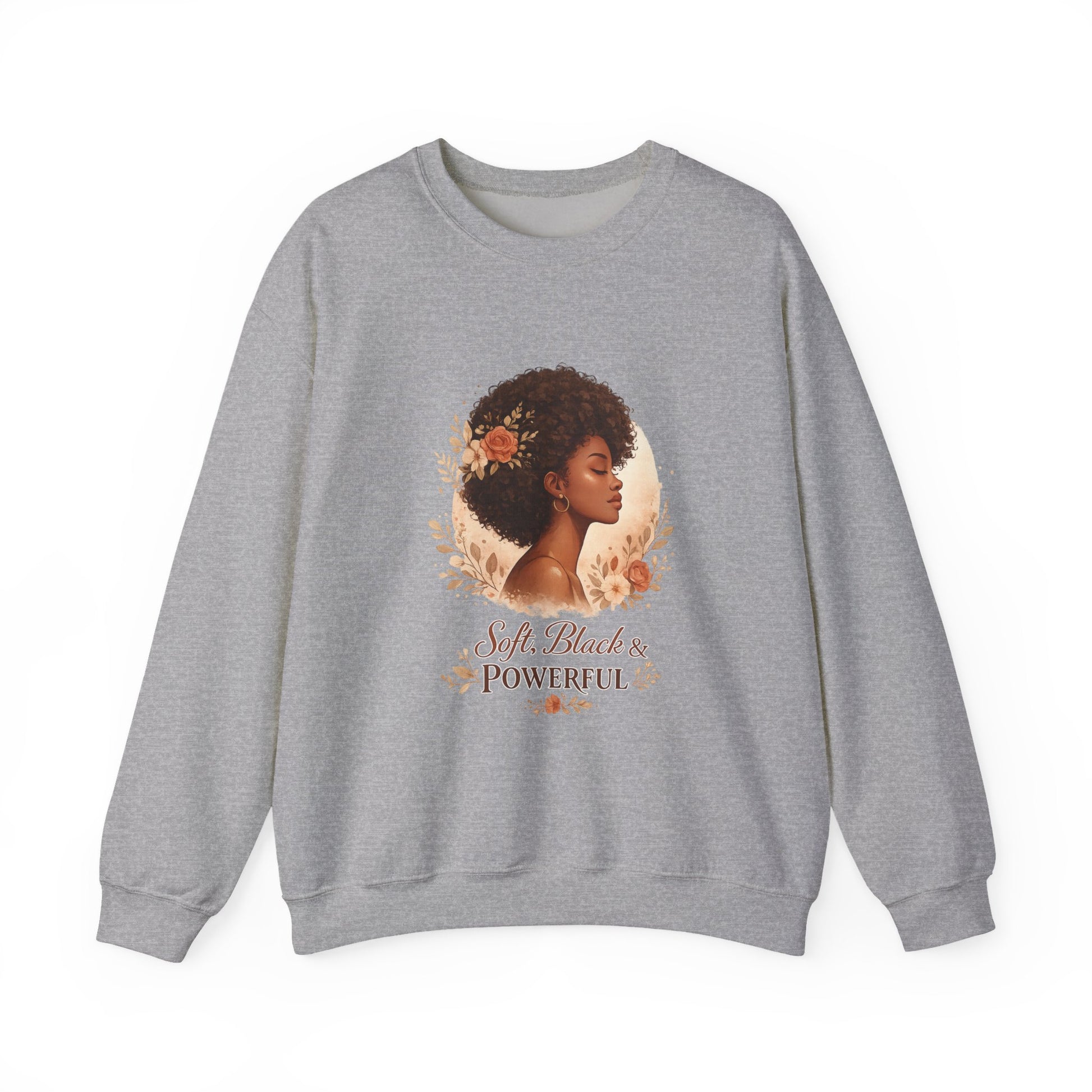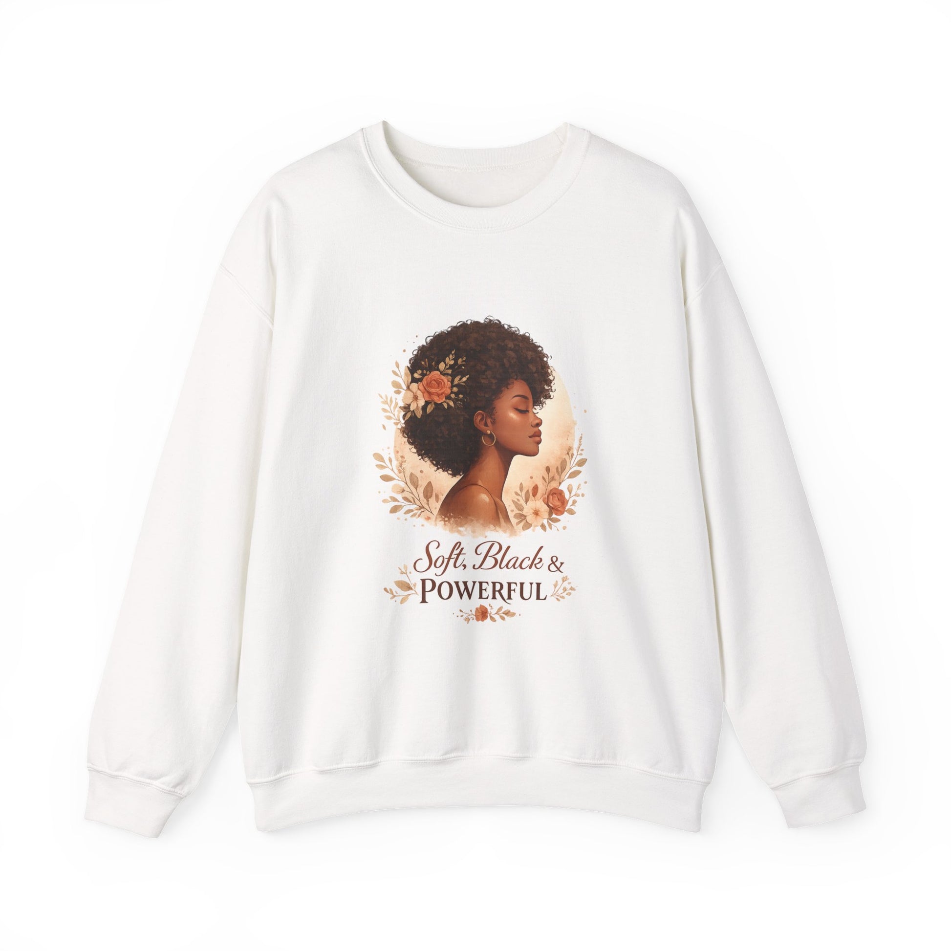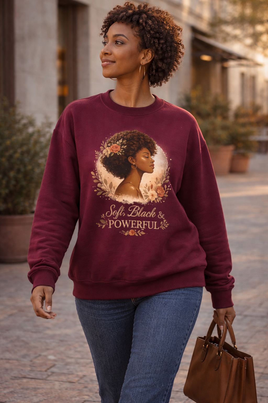 Ce hoodie allie chaleur, style et empowerment avec son illustration artistique d’une femme afro élégante entourée de fleurs délicates et du message inspirant « Soft, Black & Powerful ».